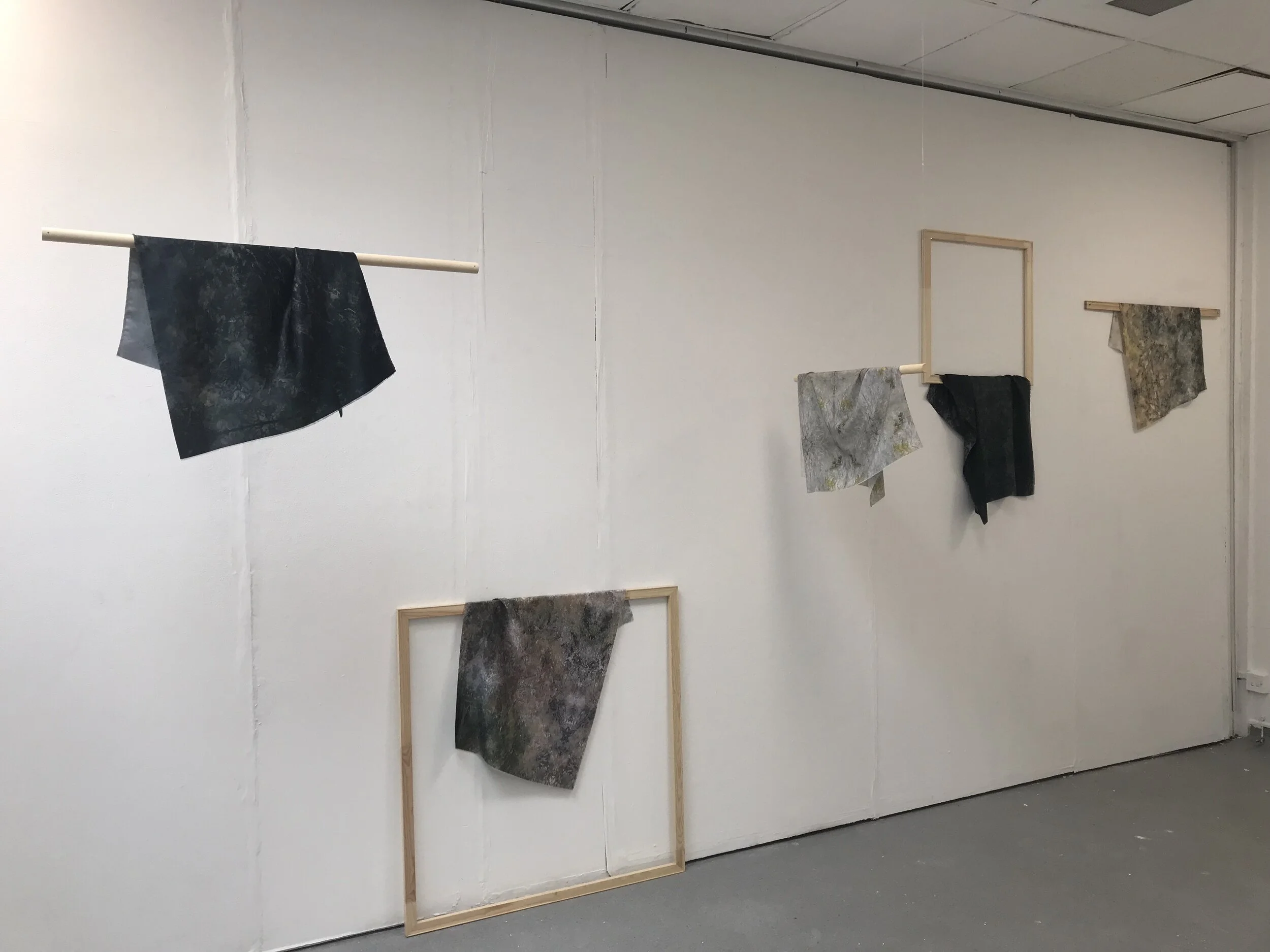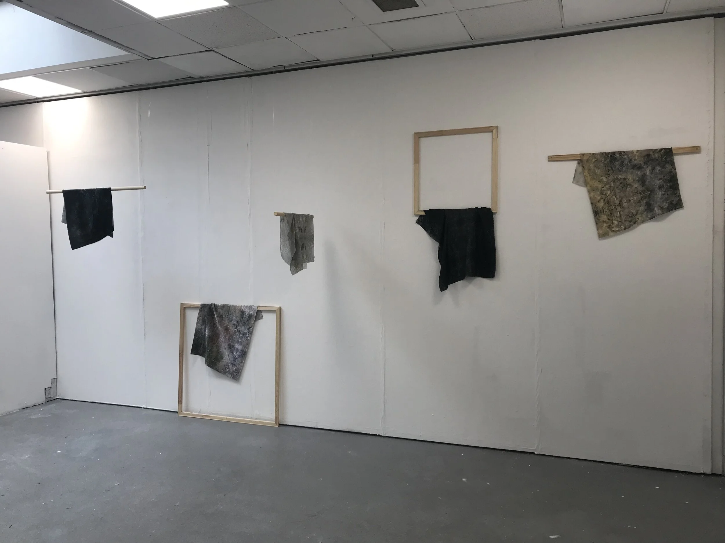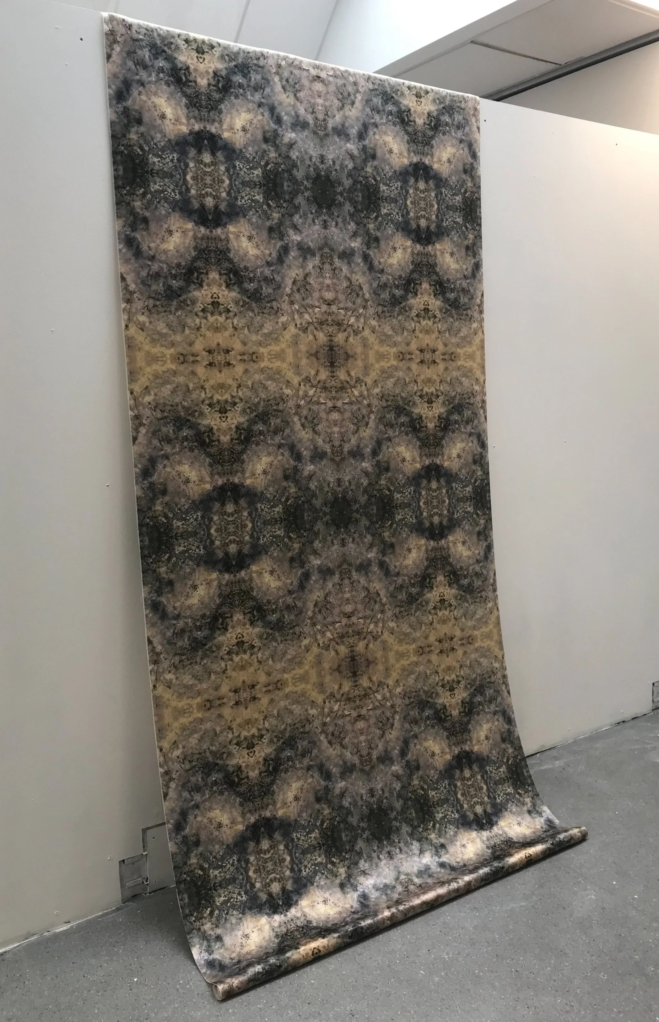 The starting point for my work is a densely painted canvas, made up of successive layers of translucent paint, which over time create a delicately layered image of indeterminate abstraction. I photograph the paint, and digitally print it onto fabric. I primarily print on silks, using their delicacy and fragility as a point of accentuation. The silks are then suspended to allow movement, hanging in a way that is suggestive of precariousness, accident, or misuse.